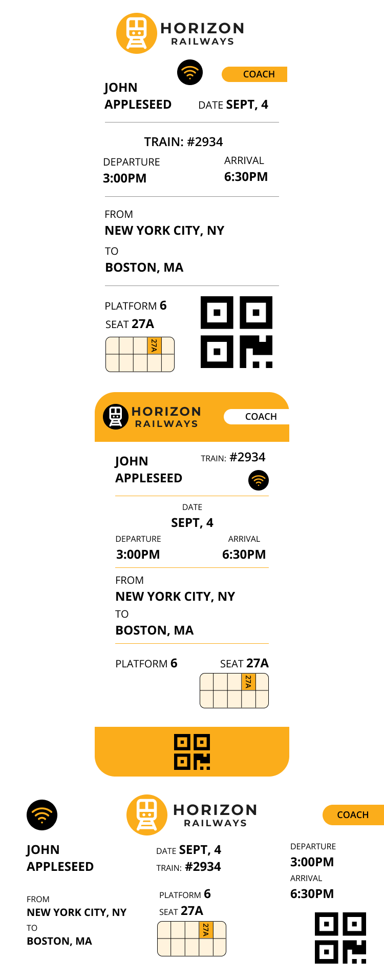 I organized the information so users could scan it. The train number, departure, and arrival stand out in bold to draw attention first. I added seating charts and QR codes so travelers could check details and board without confusion.